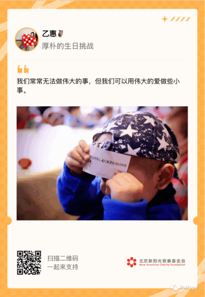 生日挑战是自己积极地赋予生日意义,让自己的存在、出生能够祝福一些有需要的人。所以每年生日的时候我会邀请朋友们和我一起,关注弱势群体,为他们奉献金钱和自己的关注。