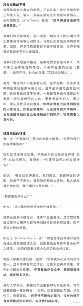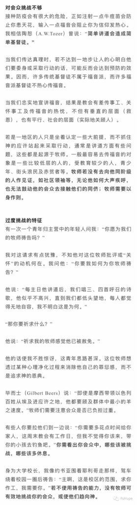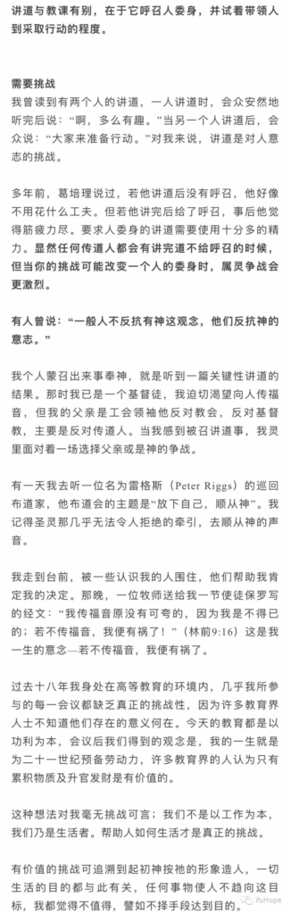 HOPE总结 好的医生会告诉你“你有病要治“”,而不是只和你说“都会好的。”而且,越严重的“病”医生越诚实也越要求病人赶紧做决定。 讲道要呼召人委身,是一件充满属灵争战的事,不借着祷告的能力就无法成事。 把握挑战的度,按需挑战都是需要神智慧的帮助的事。要靠主。 我们的讲道应该期待弟兄姊妹改变,我们也应该期待通过讲道帮助弟兄姊妹更效法耶稣基督。 文章导航 1-1 解经讲道的信念 作者 罗宾森(Haddon Robinson)1-9 在你的讲道中成长—讲道的呼召要求献上我们的最好 海波斯 Bill Hybels