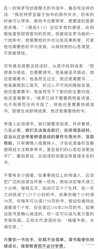 HOPE总结:的确有年度读书计划,也在扩宽自己的读书品味。不过没有想过读书的十年计划,现在想想,读十年相关领域精心挑选过的好书,的确也是能读成专家的。不错不错,挑好一个领域,实践起来。FLAG立在这里,2029年的时候来挖。 文章导航 2-16 专利的传道人—每位传道人都是独一的限量版产品 作者华伦魏斯比Warren Wiersbe2-28 神圣的期待 我们怎能处理炸药,而不期待它会爆炸? 作者 罗宾森